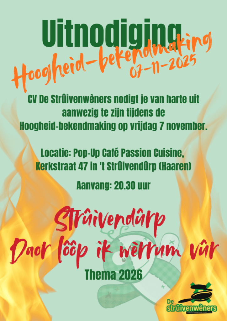 Welkom op de website van carnavalsvereniging De Strûivenwèners. Hier vind je alles over het aankomende carnavalsfeest in ons mooie Strûivendûrp. In 2026 vieren we het zottenfeest onder het thema: “Daor lôôp ik wèrrum vûr”! Het motto van de Hoogheid wordt bekend gemaakt op vrijdag 7 november 2025 tijdens de Hoogheid-bekendmaking.
